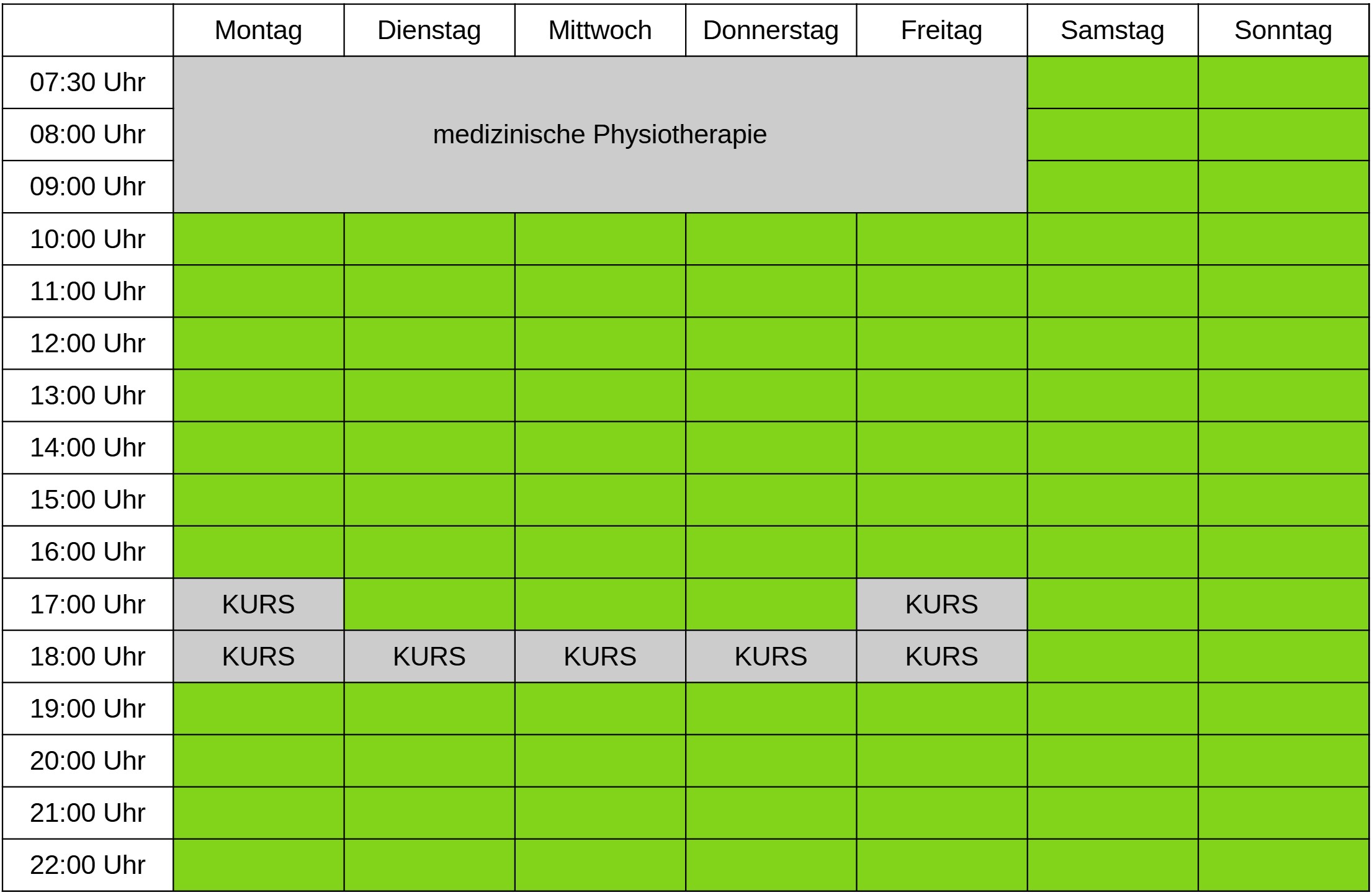 Freie Trainingszeiten (nach Einschulungskurs) sind grün dargestellt!